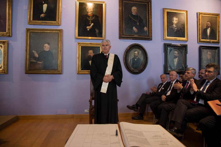 Nakon što ga je rektor proglasio počasnim doktorom Sveučilišta u Zagrebu, akademik Čović se upisao u Knjigu počasnih doktora, te prigodnim govorom obratio uzvanicima.