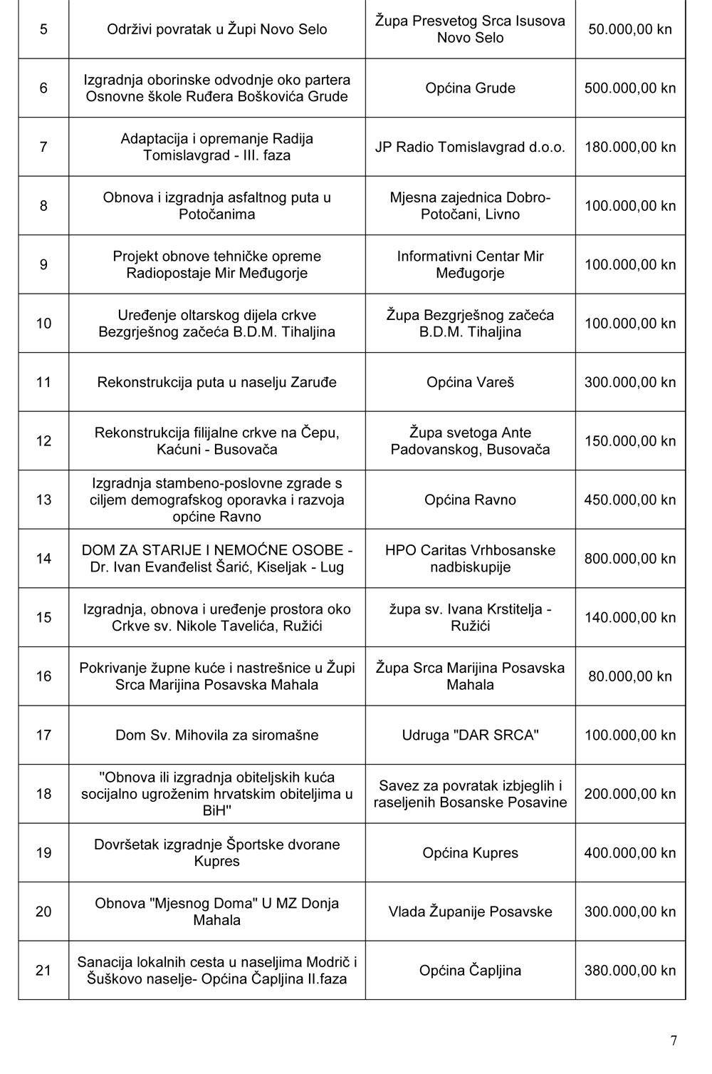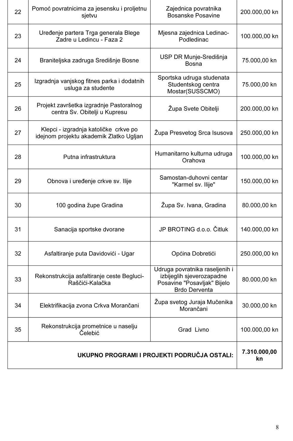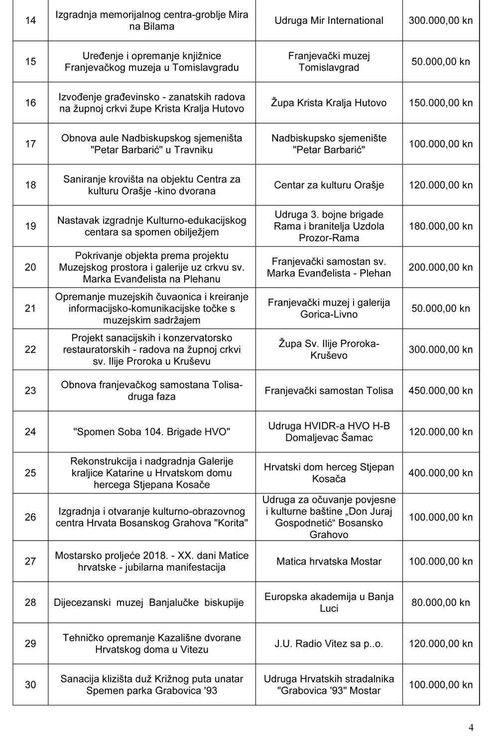 Prema objavljenoj Odluci, Udruga građana “Cvit” Međugorje – Čitluk za Književno-poučni časopis za mlade CVITAK dobila je iznos od 40.000,00 kuna. JP BROTING d.o.o. Čitluk za sanaciju sportske dvorane dobilo je iznos od 140.000,00 kuna. Također, Informativnom centaru “Mir” Međugorje za projekt obnove tehničke opreme Radiopostaje Mir Međugorje pripao je iznos od 100.000,00 kuna, dok je Župa Sv. Ivana, Gradina dobila iznos od 80.000,00 kuna.