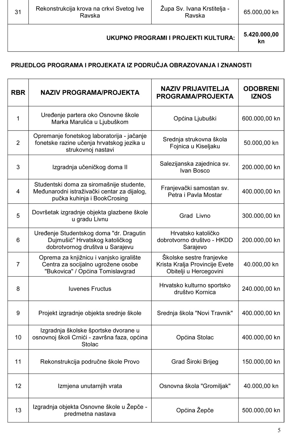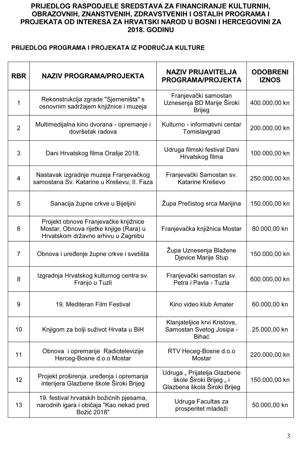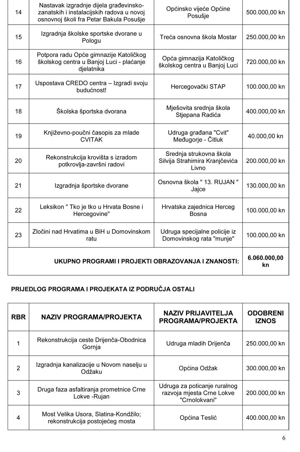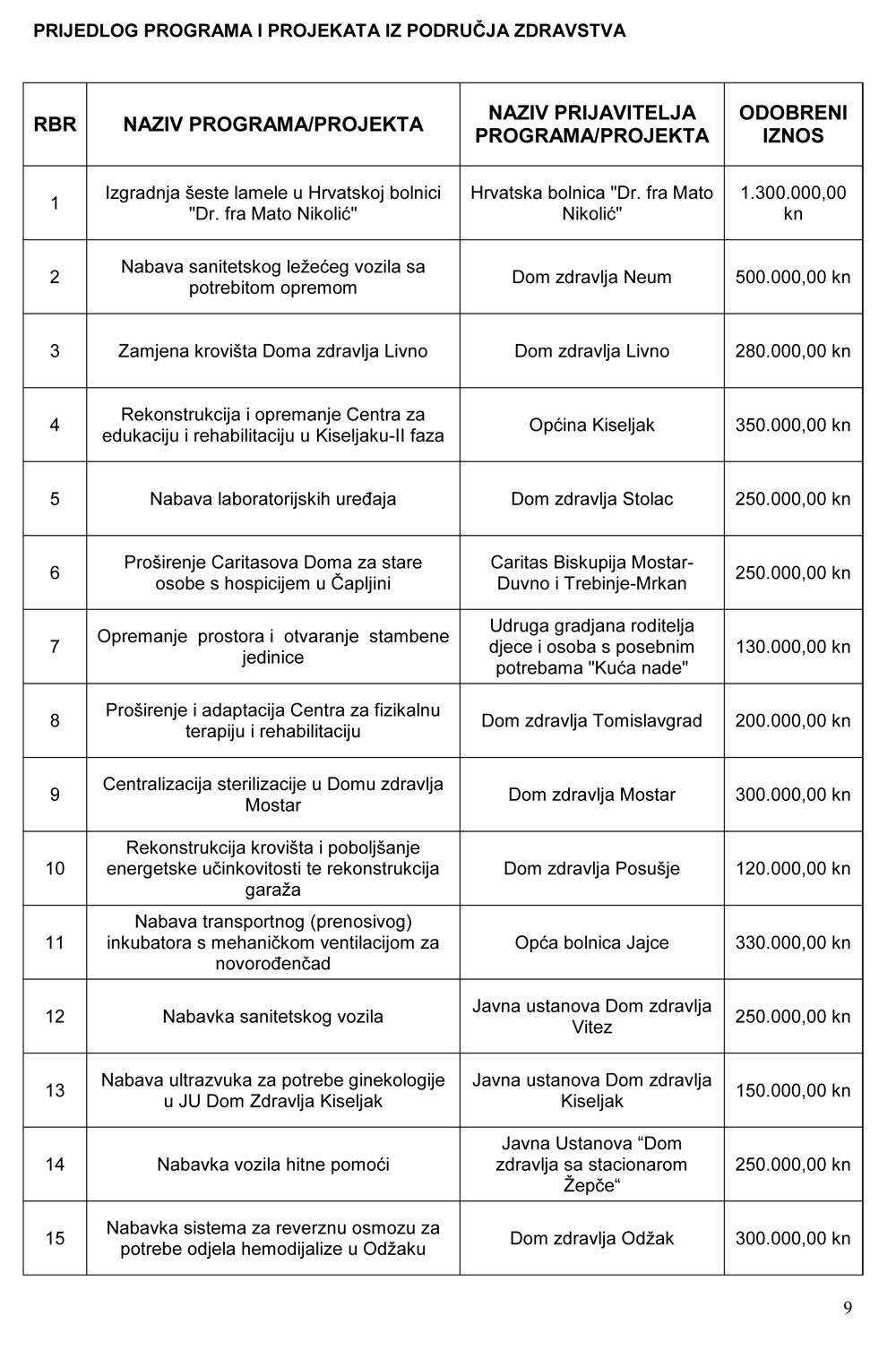 Prema objavljenoj Odluci, Udruga građana “Cvit” Međugorje – Čitluk za Književno-poučni časopis za mlade CVITAK dobila je iznos od 40.000,00 kuna. JP BROTING d.o.o. Čitluk za sanaciju sportske dvorane dobilo je iznos od 140.000,00 kuna. Također, Informativnom centaru “Mir” Međugorje za projekt obnove tehničke opreme Radiopostaje Mir Međugorje pripao je iznos od 100.000,00 kuna, dok je Župa Sv. Ivana, Gradina dobila iznos od 80.000,00 kuna.