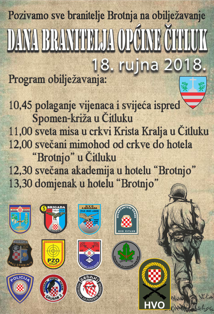 U utorak 18. rujna svečano će se obilježiti Dan branitelja općine Čitluk i 27. obljetnica organiziranja obrane Brotnja i hrvatskog naroda u BiH.