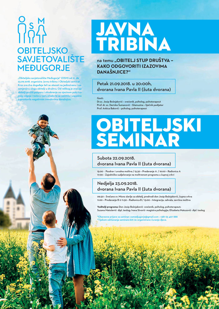 „Obiteljsko savjetovalište Međugorje“ (OSM) od 21-23.09.2018. organizira Javnu tribinu i Obiteljski seminar.