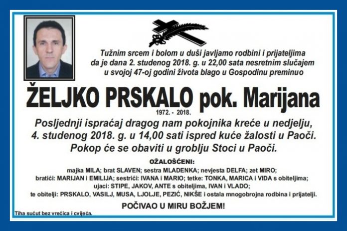 Posljednji ispraćaj biti će u nedjelju 04.11. u 14:00 sati ispred kuće žalosti u Paoči. Pokop će se obaviti u groblju Stoci u Paoči.