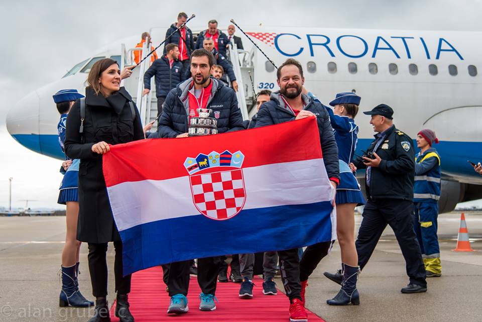 Hrvatska reprezentacija je stigla u zagrebačku zračnu luku Franjo Tuđman letom iz Pariza u 14.30 sati, ali ne na novi, već na stari terminal. Dočekao ih je vatrogasni vodeni top, mažoretkinje i crveni tepih, a prvi su iz zrakoplova izašli izbornik Krajan, predsjednica HTS-a Nikolina Babić te Čilić noseći hrvatsku zastavu i mali pokal pobjednika Davis Cupa.
