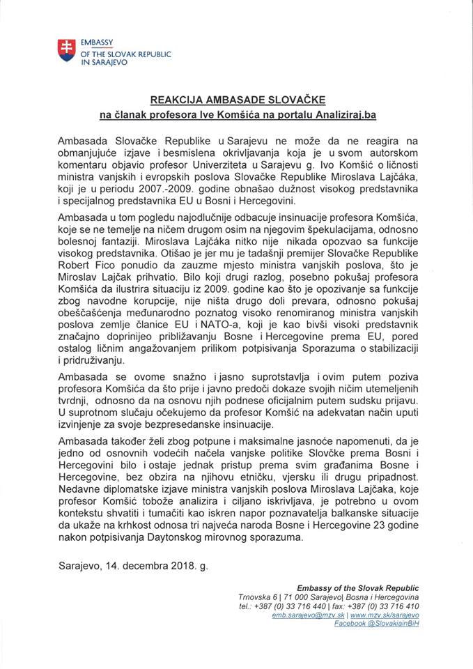 Reakcija Veleposlanstva Slovačke Republike u Sarajevu na članak prof. Ive Komšića o osobi bivšeg visokog predstavnika u BiH Miroslava Lajčáka u razdoblju od 2007. do 2009. godine.