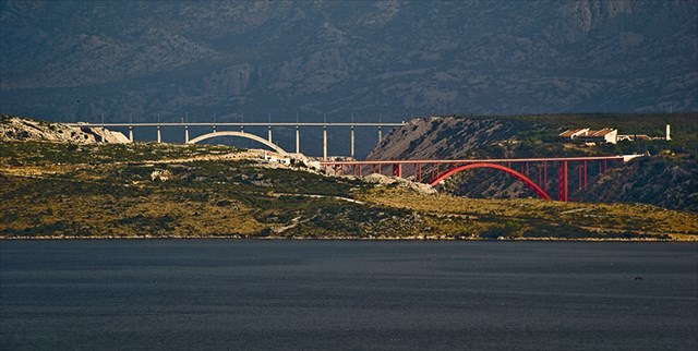 Pogled na dva Maslenička mosta, Stari čelični (crveni) i Novi armiranobetonski preko kojeg prolazi autocesta A1 Zagreb – Split.