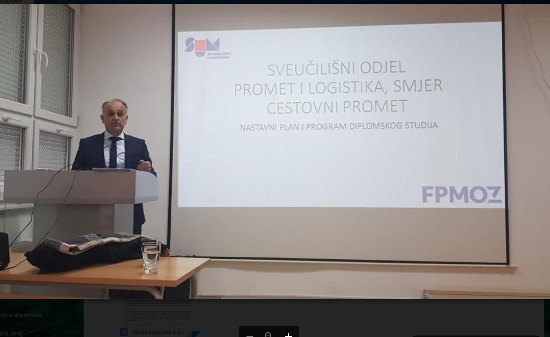 Javna rasprava o prijedlogu studijskog programa diplomskog studija Promet i logistika, smjer cestovni promet, održana je na Fakultetu prirodoslovno-matematičkih i odgojnih znanosti Sveučilišta u Mostaru te je okupila veliki broj uglednika iz struke i javnog života Mostara i Hercegovine, piše Večernji list BiH.