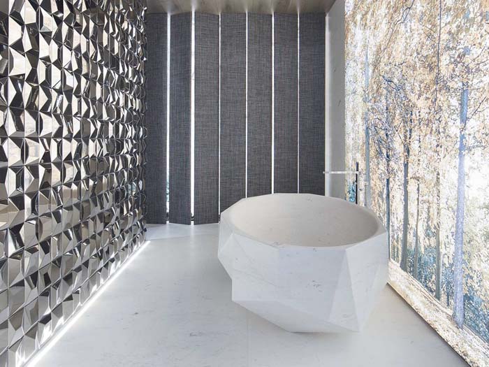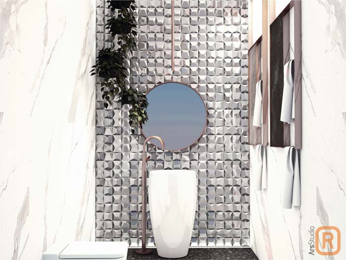 U prilogu je jedan ultra moderan ambijent pomalo eklektičan i naizgled nespojiva kombinacija svevremenske i klasične carrare, ultramodernog metaliziranog mozaika(L’anticcolonial), koji dodaje energiju na tu harmoničnu carraru.