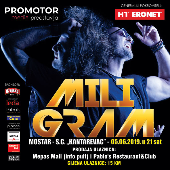 Mostar će uskoro ugostiti jedan od najpopularnijih regionalnih bendova – MILIGRAM, čiji je koncert najavljen 05.lipnja 2019u Sportskom centru Kantarevac pod generalnim pokroviteljstvom HT Eroneta.