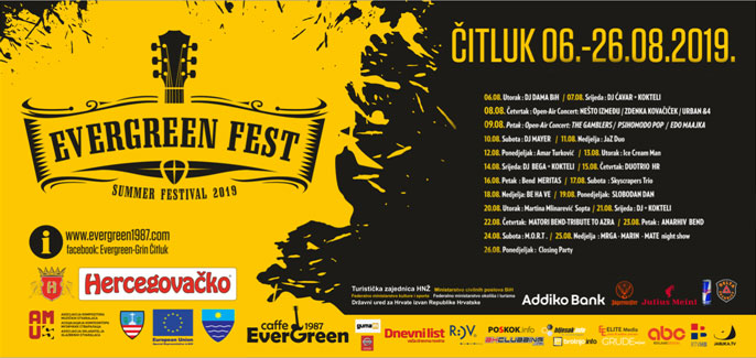 Festival i ove godine traje kroz mjesec kolovoz punih 20 dana od 6.8. do 26.8. uz podršku lokalnih, državnih i regionalnih institucija te vjernih sponzora. Evergreen Fest počinje u ponedjeljak, 06.kolovoza gdje će ga tradicionalno otvoriti ‘DJ DAMA’ i trajat će sve do nedjelje, 26. kolovoza sa svakodnevnim glazbenim, kulturnim i umjetničkim sadržajem.