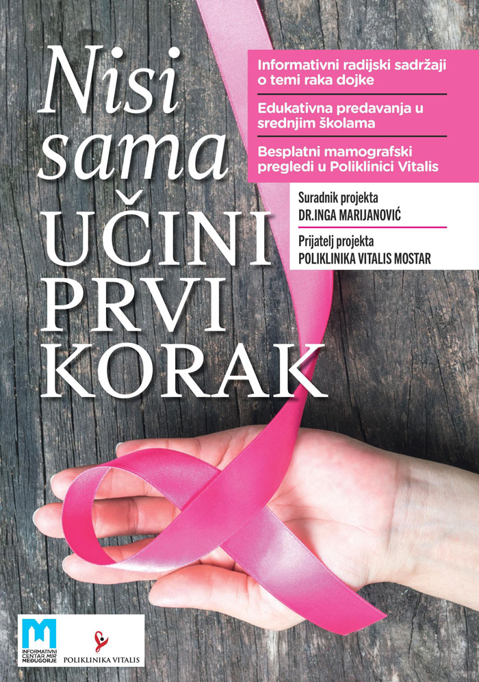 Znate li kako smrtnost od raka dojke možemo smanjiti jedino redovitim pregledima? Znate li kako je ovaj tumor u 90% slučajeva izlječiv ako ga otkrijemo na vrijeme? Ova pitanja stoje na početku kampanje Nisi sama – Učini prvi korak koju organizira radiopostaja MIR Međugorje sa suradnicima dr. Ingom Marijanović i Poliklinikom Vitalis MOSTAR.