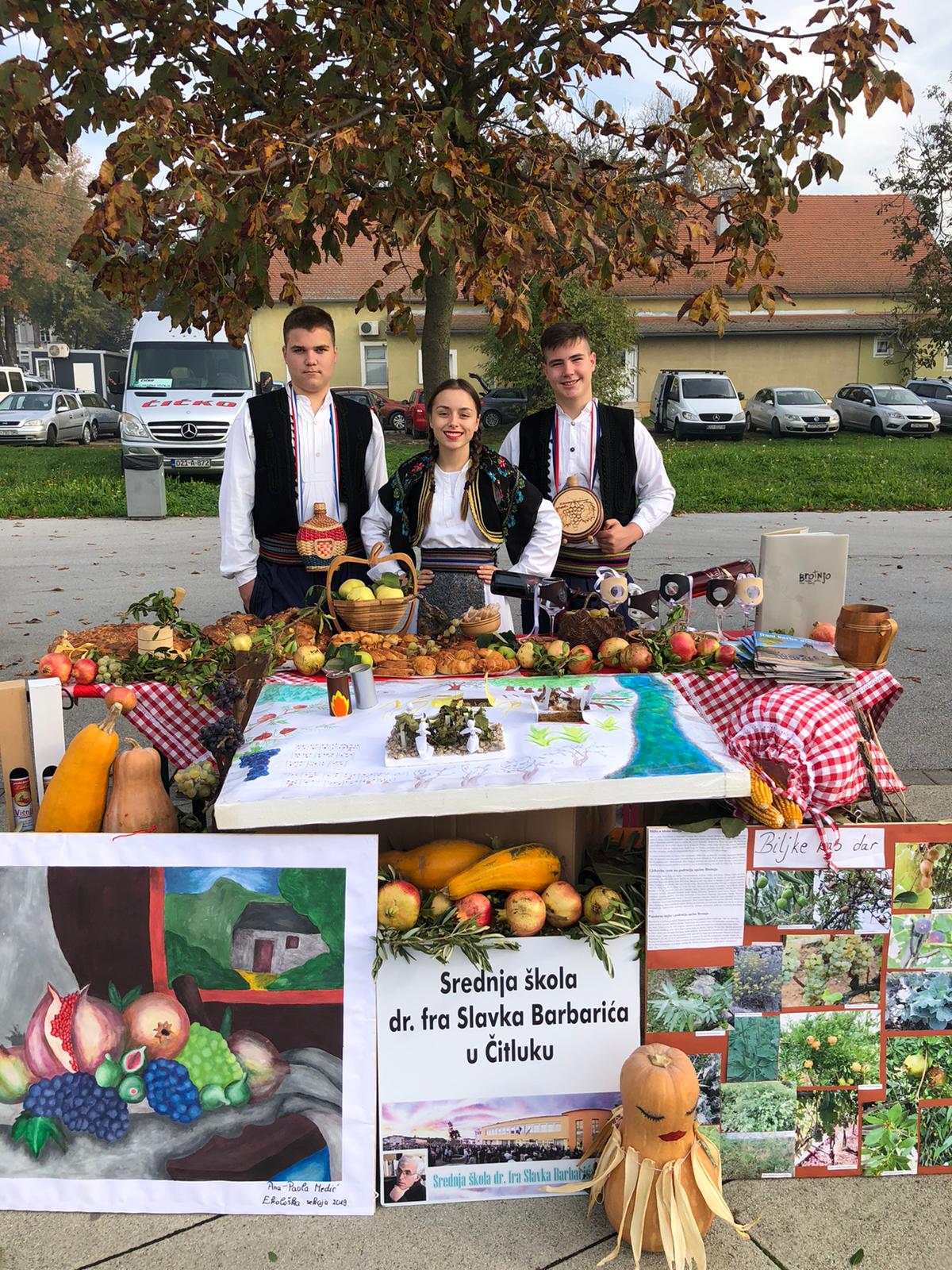 Učenici naše škole Helena Soldo (I.2), Andrijano Barbarić (II.3) i Mladen Sivrić (II.3) u pratnji ravnateljice, prof. Adele Škutor i pedagoginje Josipe Primorac također su bili dio programa izložbe na kojem su prezentirali plodove kojima je bogato naše Brotnjo. Naravno, nisu prošli nezapaženo – osim što su učenici bili odjeveni u narodne nošnje našega kraja oduševili su sudionike i raznovrsnim plodovima koji su se našli na njihovom stolu. Za pripremljenu hranu na štandu zaslužni su vrsni kuhari naše škole kojima od srca zahvaljujemo na njihovu doprinosu. Hvala i ekološkoj sekciji na prigodnim plakatima koje su izradili za ovu prigodu. Sudjelovanjem u programu ove manifestacije te ponosno predstavljajući naše mjesto i našu školu učenici su stekli još jedno zanimljivo životno iskustvo a za svoj doprinos uručena su im i priznanja koja će im svakako biti vrijedna uspomena na ovaj zanimljiv projekt. – stoji u objavi na web stranici Srednje škole dr. fra Slavka Barbarića u Čitluku.