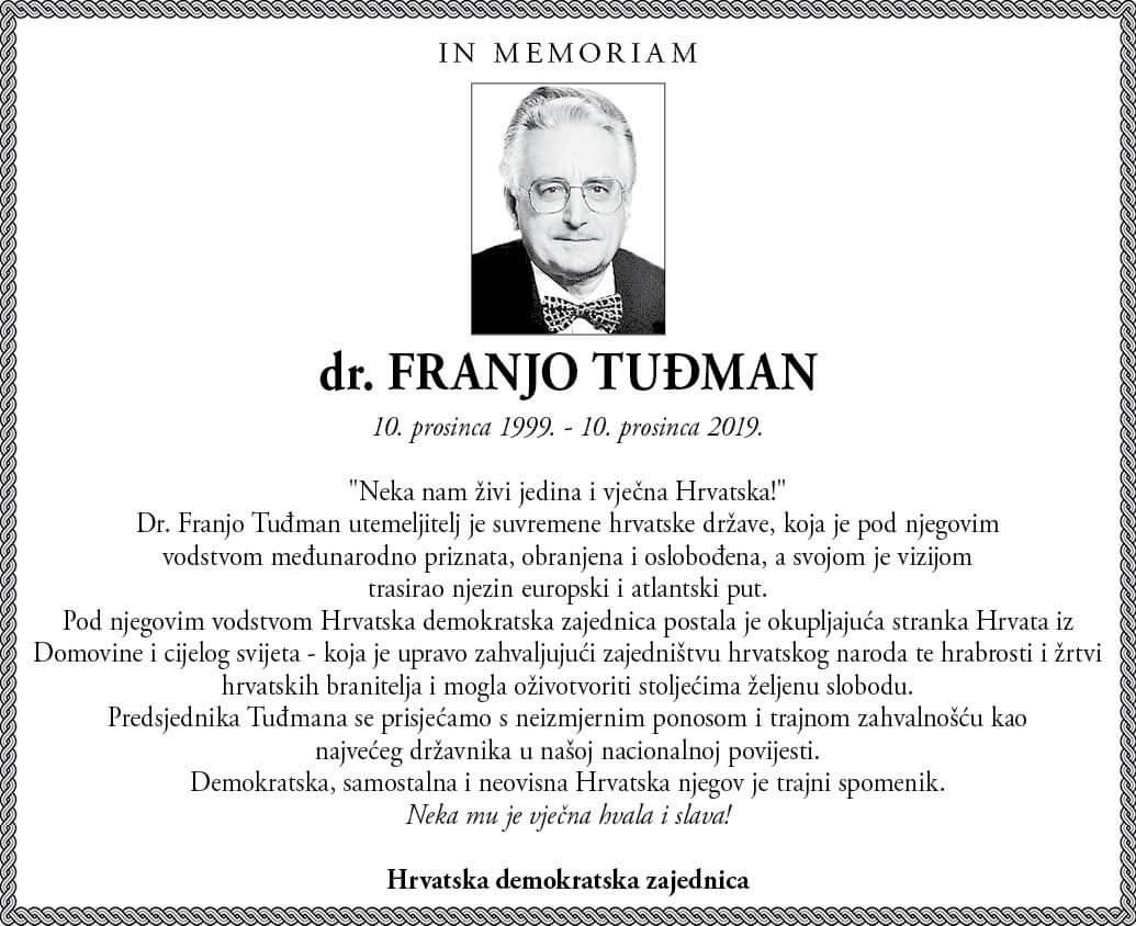 Danas se navršava 20 godina od smrti dr. Franje Tuđmana, prvog hrvatskog predsjednika i utemeljitelja samostalne hrvatske države i HDZ-a.
