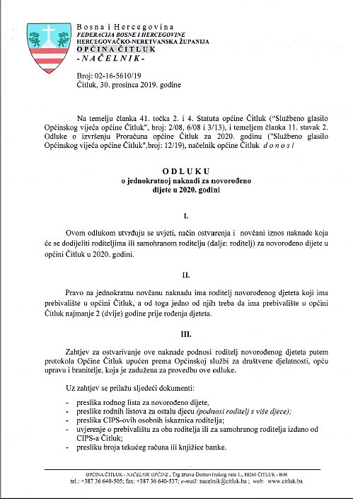 Općina Čitluk donijela je Odluku o jednokratnoj naknadi za novorođeno dijete u 2020. godini. Spomenutom odlukom utvrđeni su uvjeti, način ostvarivanja i novčani iznos naknade koja će se dodjeljivati roditeljima u 2020. godini.
