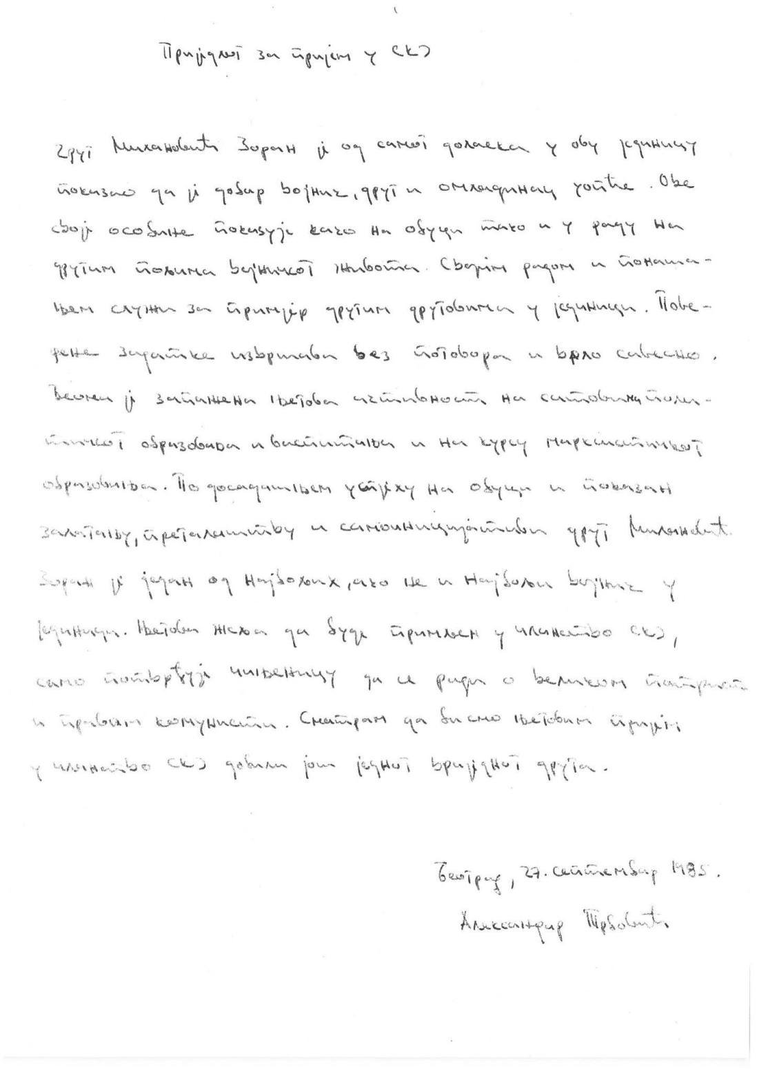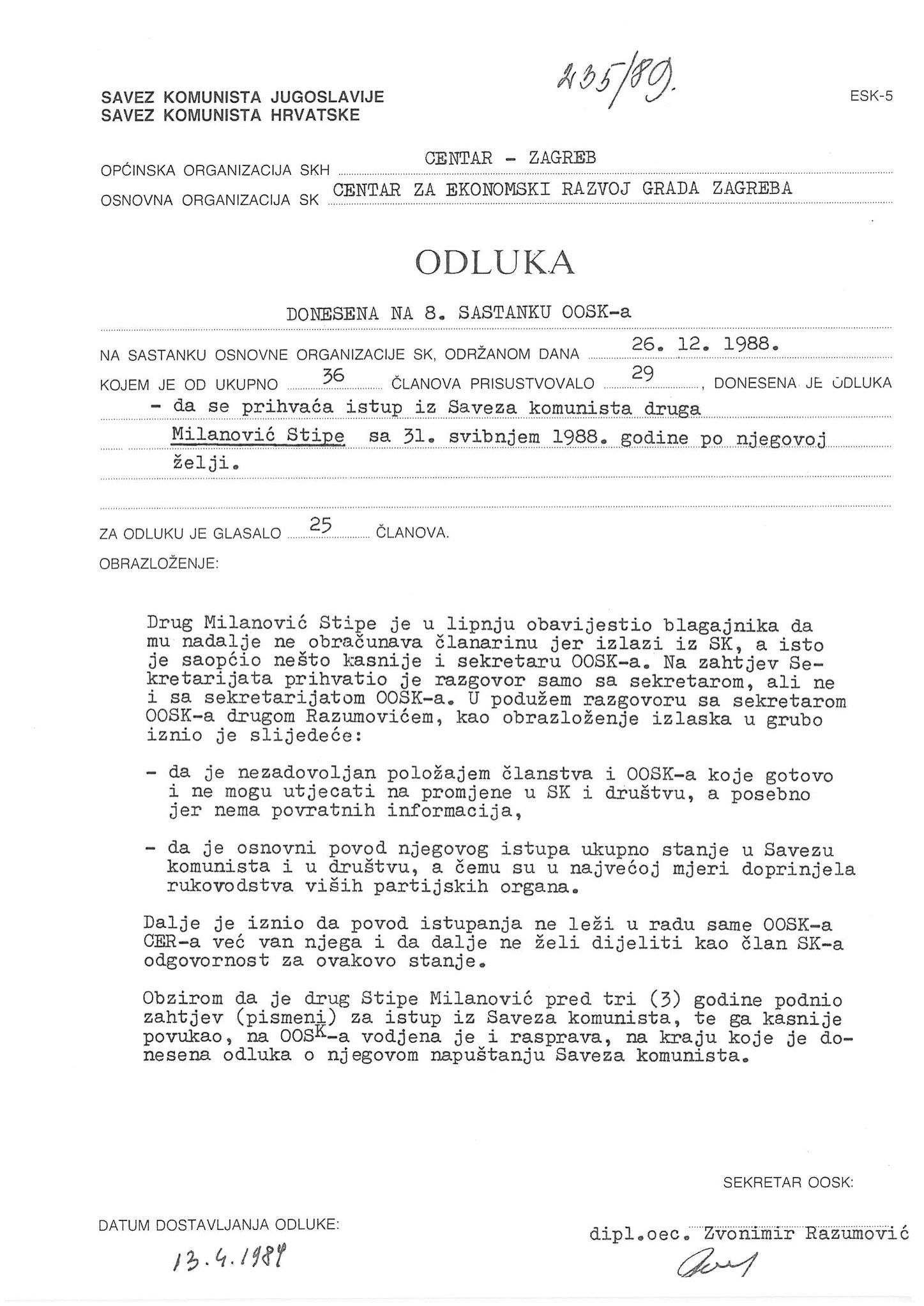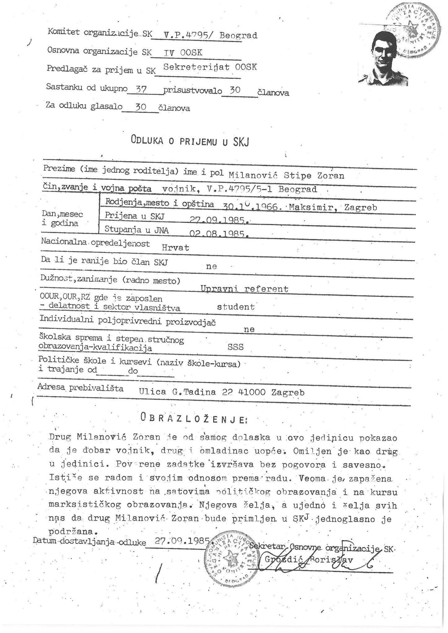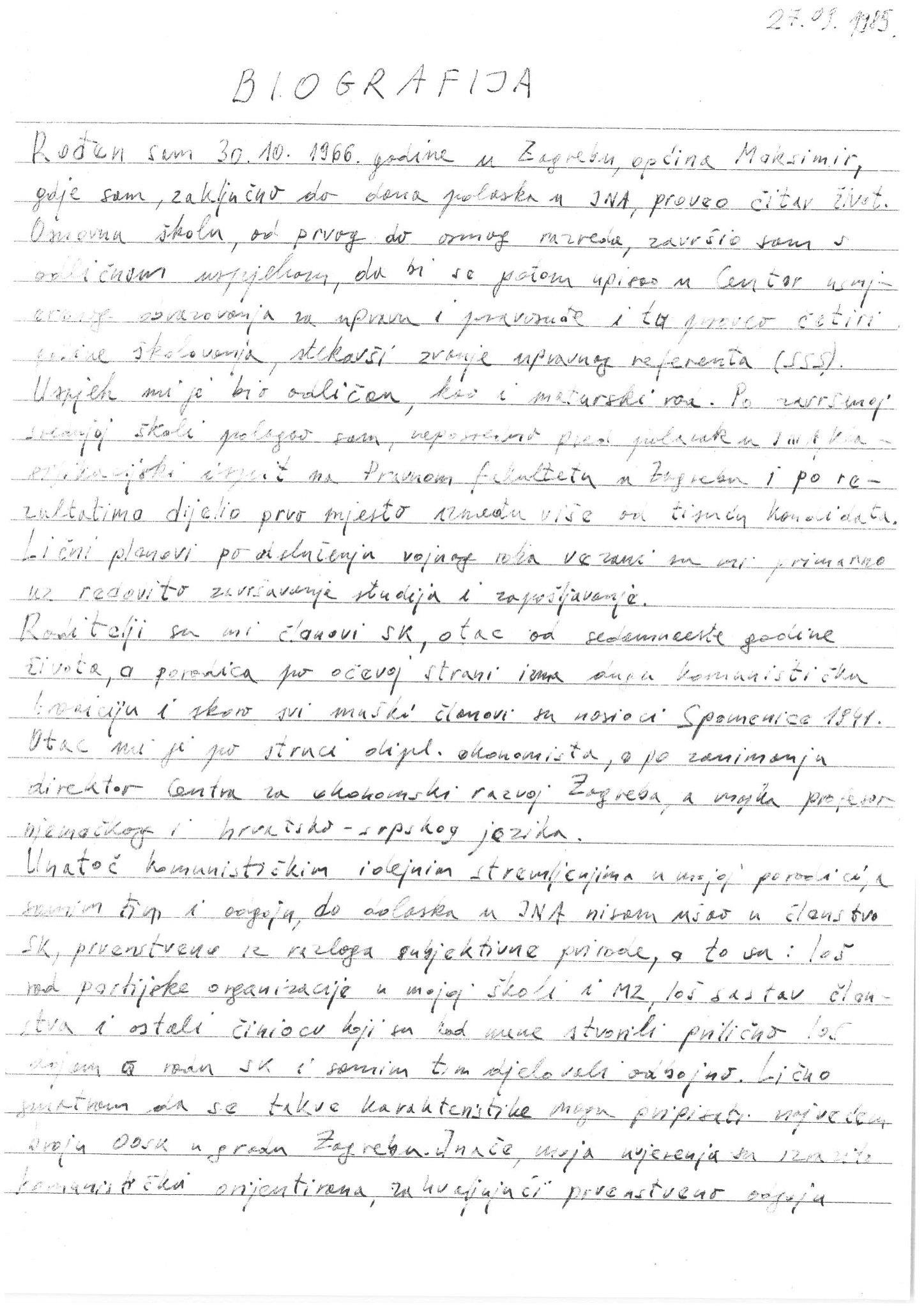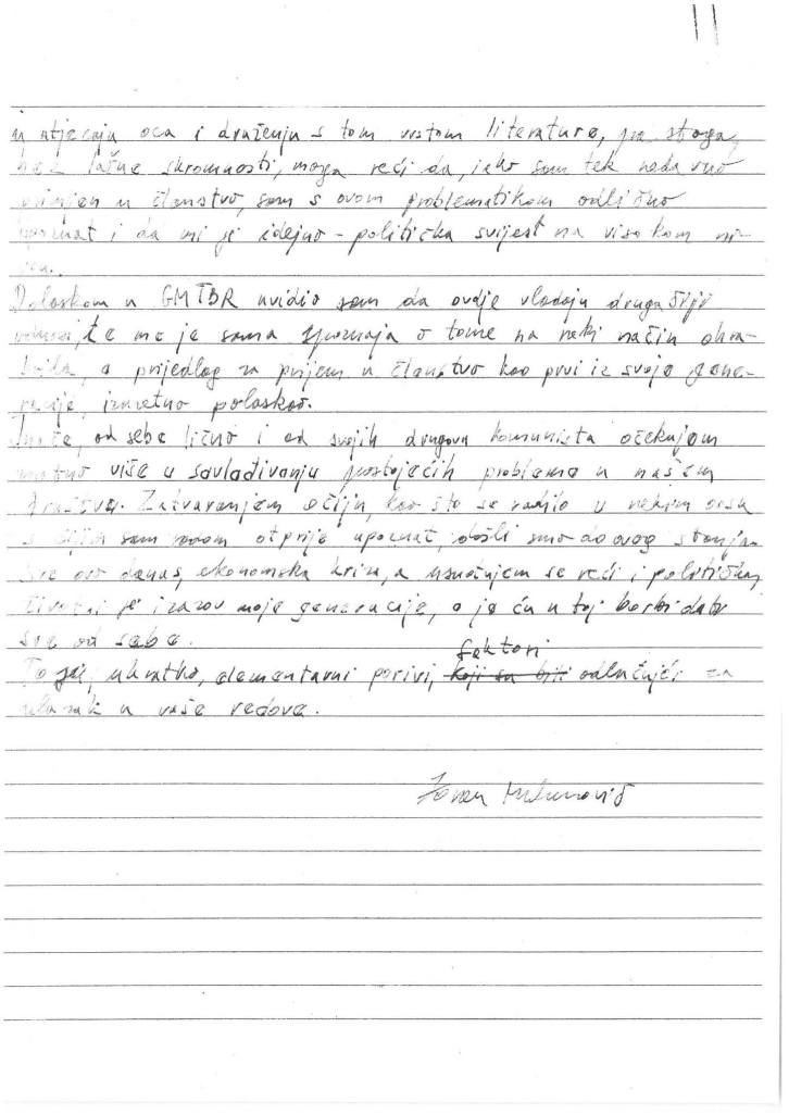 “Unatoč komunističkim idejnim stremljenjima u mojoj porodici, a samim tim i odgoju, do odlaska u JNA nisam ušao u članstvo SK, prvenstveno iz razloga subjektivne prirode, a to su loš rad partijske organizacije u mojoj školi i mjesnoj zajednici, loš sastav članstva i ostali činioci koji su kod mene stvorili prilično loš dojam o radu SK i samim tim djelovali odbojno. Lično smatram da se takve karakteristike mogu pripisati najvećem broju OOSK u Zagrebu. Inače, moja uvjerenja su izrazito komunistički orijentirana, zahvaljujući prvenstveno odgoju i utjecaju oca i druženju s tom vrstom literature, pa stoga bez lažne skromnosti mogu reći da, iako sam tek nedavno primljen u članstvo, sam s ovom problematikom odlično upoznat i da mi je idejno-politička svijest na visokom nivou“