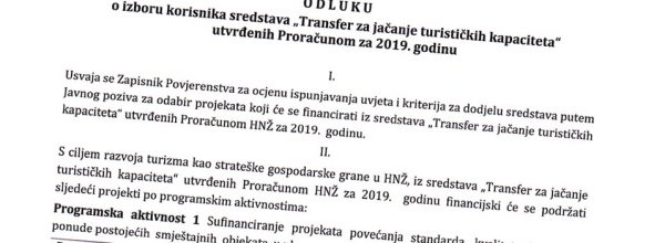 Ministarstvo trgovine, turizma i zaštite okoliša HNŽ donijelo je odluku o izboru korisnika sredstava „Transfer za jačanje turističkih kapaciteta“ utvrđenih Proračunom za 2019. godinu. Pravo na sredstva ostvarilo je 138 korisnika u ukupnom iznosu od milijun KM, od čega je njih 15 s područja općine Čitluk.