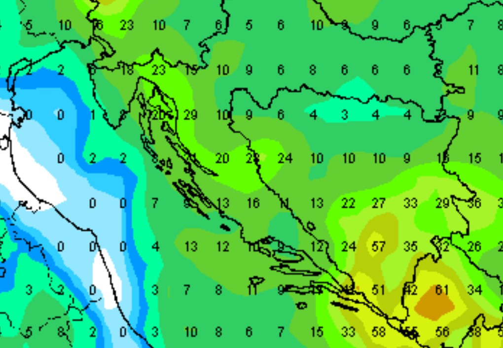 Obilna kiša se očekuje na Jadranu i dijelovima uz Jadran, gorskoj Hrvatskoj, zatim, zapadnoj, jugozapadnoj dijelu istočne i srednje Bosne i u Hercegovini.
