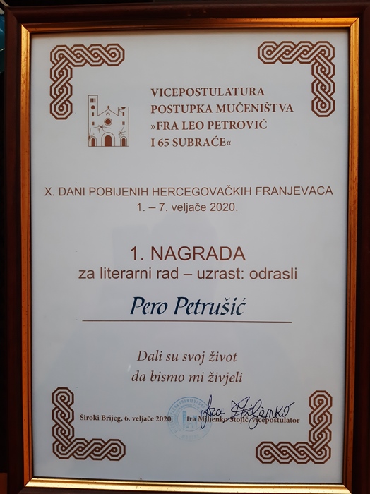 Literarni rad koji je ujedno i tekst za buduću slikovnicu pod nazivom „Mučenici“ proglašen je najboljim na ovogodišnjem natječaju, te je osvojio prvu nagradu. Autor teksta je naš Brotnjak Pero Petrušić iz Čalića.