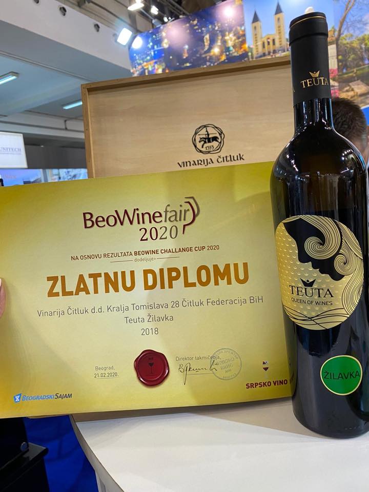 Zlatnu medalju i titulu šampiona među crvenim vinima s 91. osvojenim bodom odnijela je Teuta Trnjak, berba 2017., Vinarije Čitluk. Priznanje je preuzeo direktor naše najveće vinarije Željko Nakić.