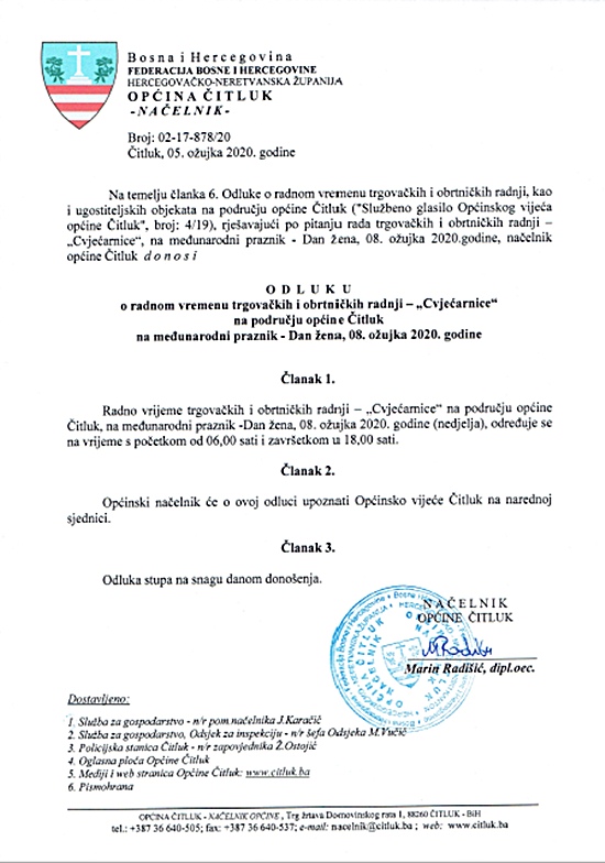 Odlukom o radnom vremenu trgovačkih i obrtničkih radnji „Cvjećarnice“ na području općine Čitluk na međunarodni praznik Dan žena propisano je da će spomenute radnje 8. ožujka na području općine Čitluk moći raditi u vremenu od 06,00 do 18,00 sati.