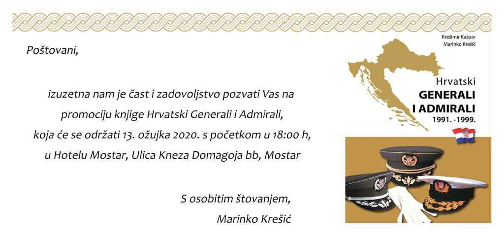 U petak 13. ožujka 2020. godine u Hotelu Mostar biti će upriličena promocija knjige „Hrvatski generali i admirali 1991.-1999.“ čiji su autori generali Krešimir Kašpar i Marinko Krešić.