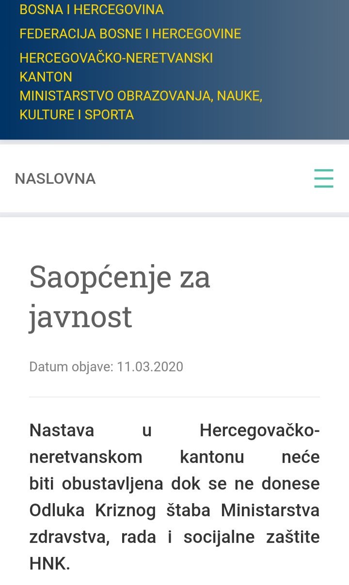 Nastava u Hercegovačko-neretvanskoj županiji neće biti obustavljena dok se ne donese Odluka Kriznog stožera Ministarstva zdravstva, rada i socijalne skrbi HNŽ, priopćeno je iz Ministarstva obrazovanja HNŽ.