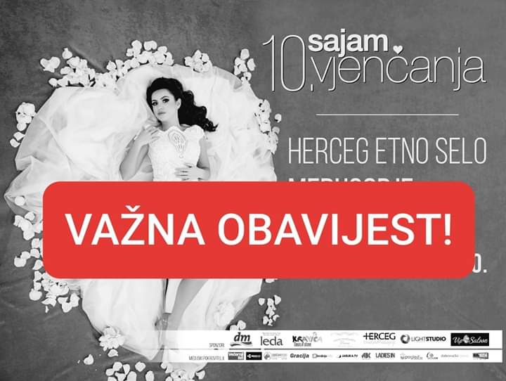 Sukladno preporukama ministarstva zdravstva Federacije BiH i ostalih nadležnih institucija vezano uz javna okupljanja i uz nove okolnosti oko širenja korona virusa (COVID-19) kod nas i u svijetu, 10. Sajam vjenčanja , koji se trebao održati 28. i 29.3.2020. godine u Herceg Etno selu u Međugorju, odgađa do daljnjeg.