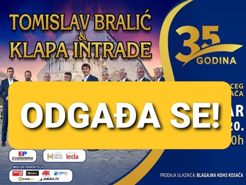 U okolnostima najnovijih događanja vezanih za korona virusa (COVID-19) kod nas i u svijetu, a prema preporukama ministarstva zdravstva Federacije BiH i ostalih nadležnih institucija vezano uz javna okupljanja i uz nove okolnosti oko širenja korona virusa, organizatori koncerta, koji se trebao održati 26.3.2020. godine u HDHS Kosača, u Mostaru, odlučili su koncert odgoditi.