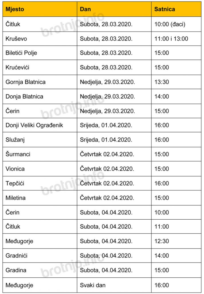 U nastavku donosimo raspored ispovijedi po župama i mjestima u Broćanskom dekanatu.