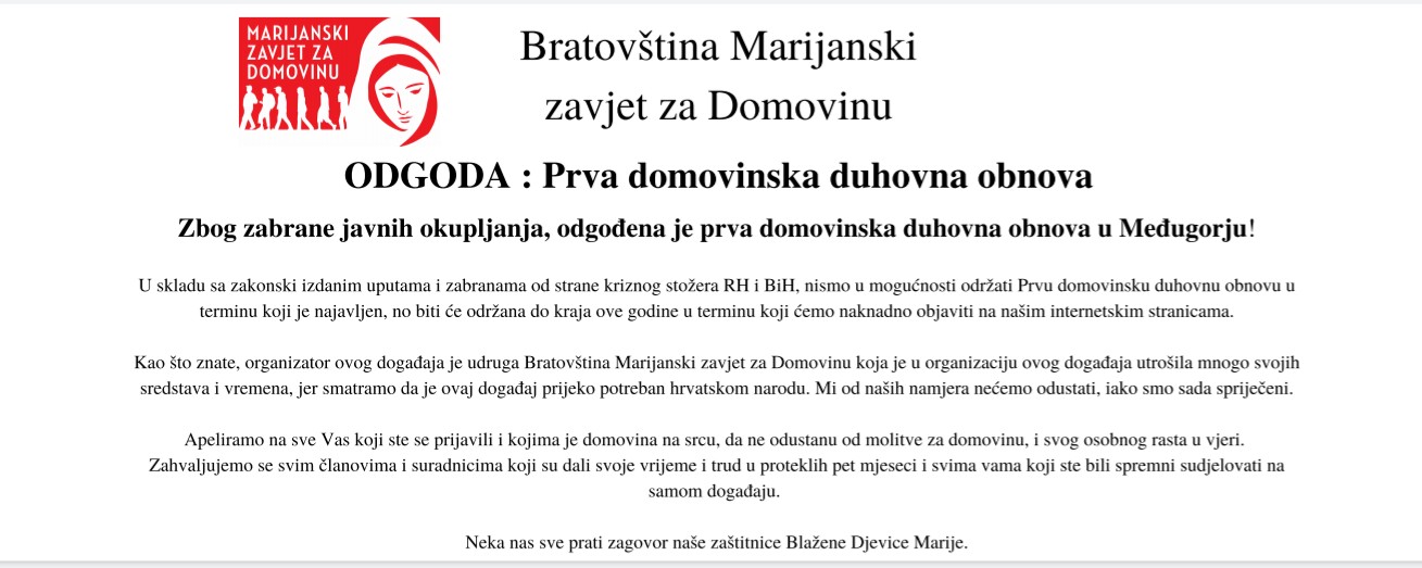 U skladu sa zakonski izdanim uputama i zabranama od strane kriznog stožera RH i BiH, nismo u mogućnosti održati Prvu domovinsku duhovnu obnovu u terminu koji je najavljen, no biti će održana do kraja ove godine u terminu koji ćemo naknadno objaviti na našim internetskim stranicama.