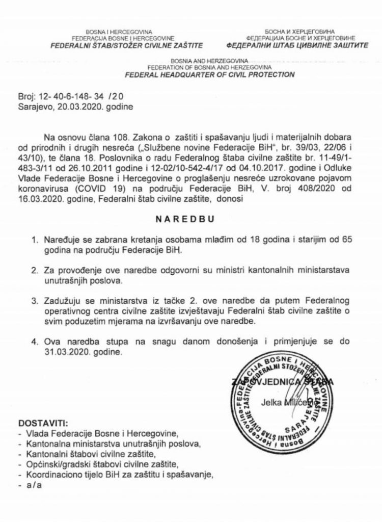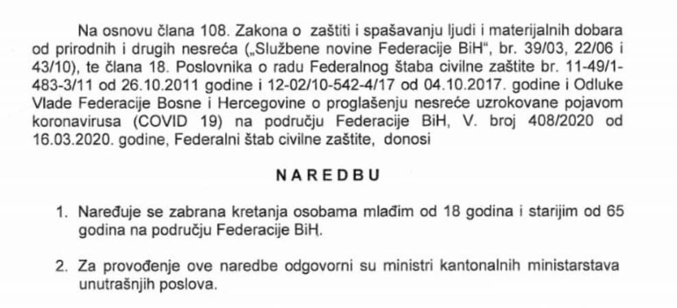 Federalni stožer civilne zaštite danas je donio naredbu u kojoj je osobama mlađim od 18 te starijim od 65 godina zabranjeno kretanje na području FbiH.