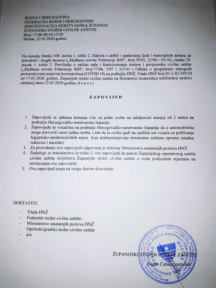 Županijski stožer civilne zaštite HNŽ donio je novu zapovijed.