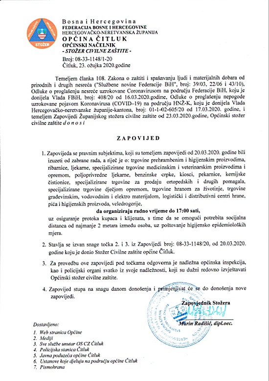 Općinski stožer civilne zaštite danas je izdao zapovijed vezanu za radno vrijeme pravnih subjekata, koji su bili izuzeti u ranijoj odluci, kojom se nalaže organiziranje radnog vremena do 17:00 sati.