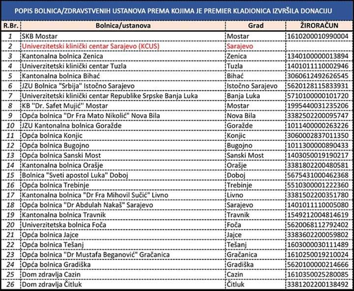 Univerzitetska klinička bolnica u Sarajevo (KCUS) također je kontaktirana s ciljem uplate donacije, međutim iz Kabineta generalne direktorice Prof. dr. Sebije Izetbegović, kroz dva dana (25.03., 26.03.) nam nisu dostavili podatke potrebne za uplatu donacije. Ovim putem pozivamo KCUS na dostavu podataka (e-mail s pismom namjere su zaprimili) kako bismo mogli provesti uplatu.