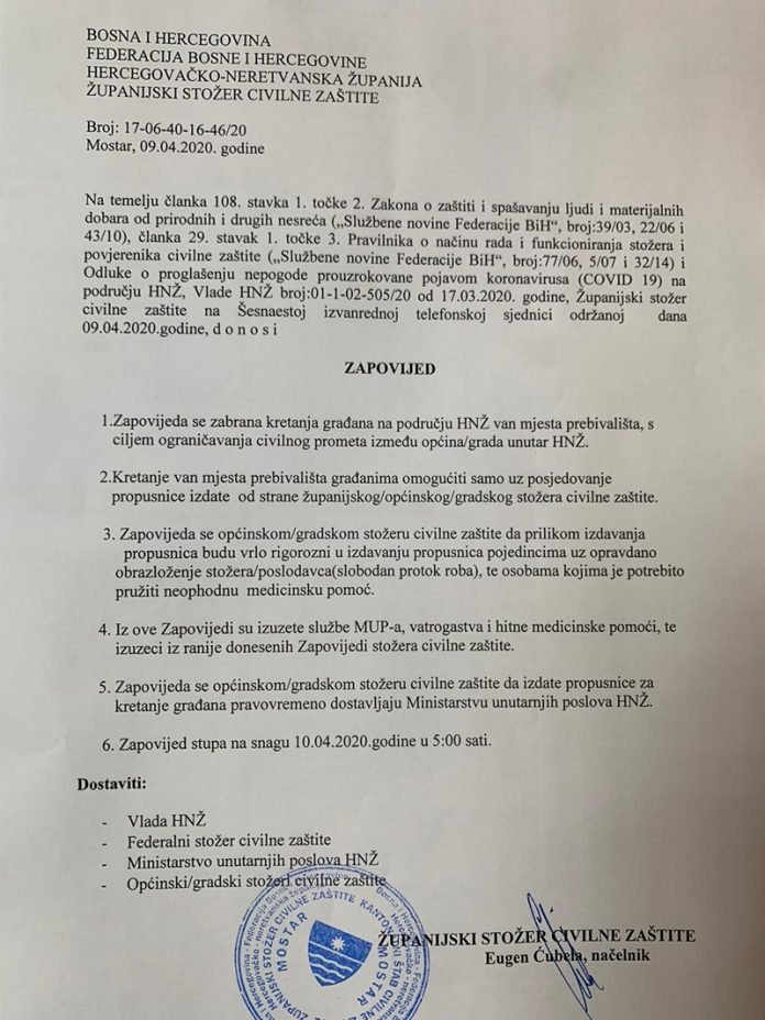 Zapovijed o zabrani kretanja građana na području HNŽ izvan mjesta prebivališta, s ciljem ograničavanja civilnog prometa između općina/gradova na području HNŽ danas je izdao Stožer civilne zaštite HNŽ.
