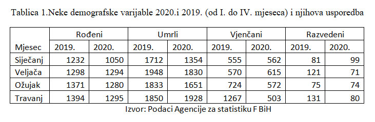 Epidemija COVID-19 u F BiH tijekom prva četiri mjeseca 2020. gledajući na isto razdoblje prošle godine od svih demografskih varijabli najviše se odrazila na broj vjenčanja koji se smanjio za 864 ili 27%. Tako se u ožujku 2020. udio vjenčanja u F BiH smanjio za 21%, a u travnju za 60%, što će se značajno odraziti na smanjenje stope rodnosti krajem ove te početkom iduće godine. No, i nadalje se nastavlja s restrikcijama i uvođenju novih mjera protiv širenja virusa COVID-19 kako u cijeloj zemlji tako i šire, a s time se odgađa niz javnih i društvenih događanja pa je većina svadbi prolongirana za neko „bolje“vrijeme.