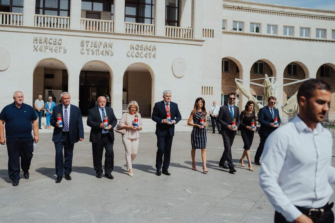 Prije početka svečane sjednice uže Predsjedništvo HDZ-a BiH položilo je vijenac i svijeće kod spomenika poginulim braniteljima na Trgu hrvatskih velikana ispred Hrvatskoga doma hercega Stjepana Kosače