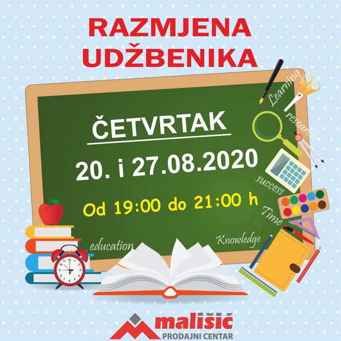 Obavještavamo Vas da će se održati još jedne razmjene udžbenika u prodajnom centru Mališić Međugorje u četvrtak, 20.08. i 27.08.2020.g. od 19:00 -21:00 h.