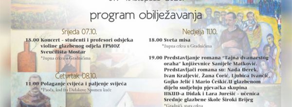 Sedamnaesti po redu Didakovi dani, kulturno-duhovna manifestacija, koju u čast velikog hercegovačkog svećenika, prosvjetitelja i vizionara fra Didaka Buntića, u njegovoj rodnoj župi Gradnići organizira Hrvatsko-kulturno umjetničko društvo Didak i župa sv. Blaža Gradnići, ove godine održavat će se kroz četiri dana, od 7. do 11. listopada. Kao i svih dosadašnjih, tako je i za … Nastavi čitati Najavljujemo: 17. Didakovi dani od 7. do 11. listopada