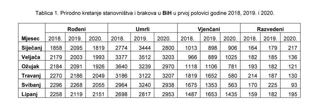 Na razini BiH broj rođenja u prvoj polovici 2020. manji je za 6% u odnosu za isto razdoblje iz 2019.godine. Glede broja umrlih može se reći da COVID-19 nije doprinio većem broju umrlih, naprotiv u prvih šest mjeseci ove godine u BiH je bilo 6,7% manje smrtnosti u odnosu na isto razdoblje prošle godine. Čak povećan broj smrtnosti ove godine u mjesecu travnju u odnosu na isti mjesec iz prošle godine ne možemo dovesti u svezu s epidemijom, ako se zna da je smrtnost odraslih nešto veća krajem zime i tijekom proljeća. Stope smrtnosti korona virusom procjenjuju se na oko 3%, a pretpostavlja se da je u stvari niža, dok je smrtnost povijesnih epidemija bila daleko viša. Ali zato je COVID-19 drastično utjecao na broj vjenčanja koji se smanjio za 30%, a što će se najdirektnije odraziti na stopu rodnosti, jer se kod nas još uvijek preko 90% djece rađa u bračnim zajednicama. Glede razvoda, tu je došlo do smanjenja rastava u odnosu na prošlu godinu za 21,7%, a u odnosu na pretprošlu godinu za nekih 17,5%. Najvjerojatnije, da će ublažavanjem mjera pandemije doći do porasta broja rastava, a što se vidi iz mjeseca lipnja i srpnja 2020. (tablica 1).
