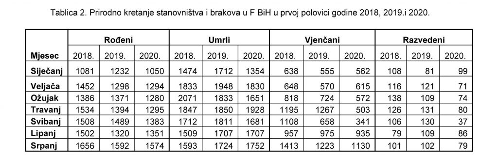 Na temelju službenih podataka Agencije za statistiku BiH i F BiH u nastavku će biti dat pregled o prirodnom kretanju stanovništva i brakovima na razini BiH, F BiH i županijama u kojima živi najveći broj hrvatskog stanovništva. Umjesto rezultata iz samo prvih šest mjeseci, prikazani su i rezultati za mjesec srpanj da bi se vidjelo kolike su drastične promjene u broju vjenčanja, rođenja, ali i rastava odmah dok su olabavile protupandemijske mjere, i to na svim razinama.
