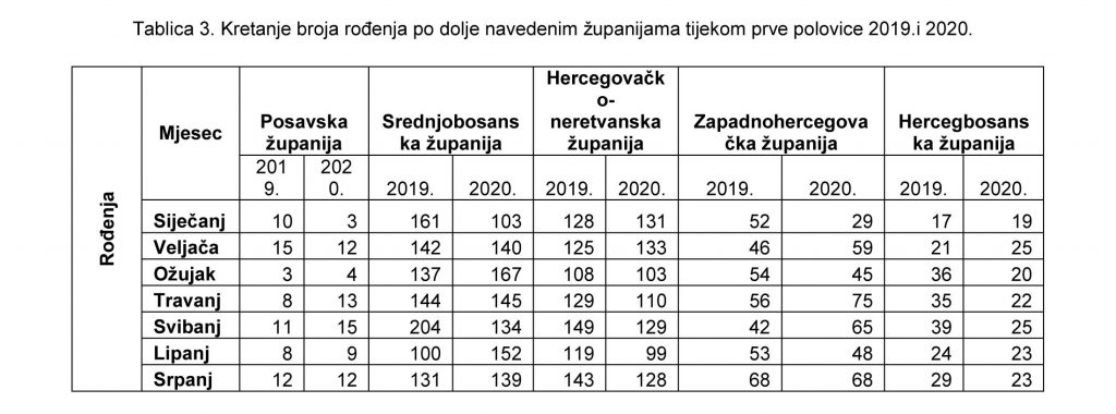 Kad su u pitanju rođenja po županijama u prvoj polovici 2020. u odnosu na isto razdoblje iz 2019. godine situacije su različite od županije do županije. Posavska županija koja inače ima mali broj rođenja situacija je gotovo identična tijekom obadvije polovice godine. Srednjobosanska županija je ostvarila manji broj rađanja za 3,8% u odnosu na isto razdoblje iz prošle godine, ali se vide pozitivni trendovi za vrijeme pandemijskog popuštanja tijekom lipnja i srpnja 2020., Hercegovačko-neretvanska županija bilježi pad broja rođenih za 7,5%, dok je jedino Zapadnohercegovačka županija ostvarila povećan broj rođenja za 4,6%. Hercegbosanska županija ima najporaznije rezultate po pitanju broja rođenja jer su oni smanjeni u odnosu za isto vrijeme iz prošle godine za 22% (tablica 3).