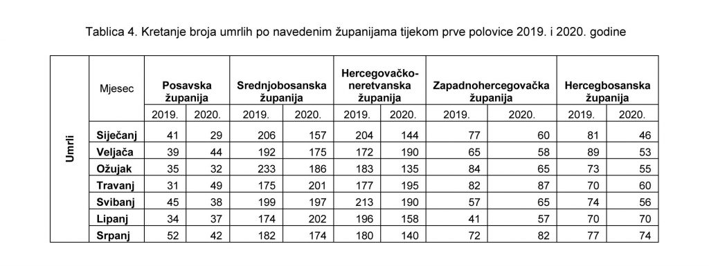 Što se tiče broja umrlih po navedenim županijama, situacija je takva da su sve županije zabilježile manji broj umrlih u prvoj polovici 2020. u odnosu na isto razdoblje iz 2019., tako da je u Posavskoj županiji manje umrlih za 2%, Srednjobosanskoj za 5%, Hercegovačko-neretvanskoj županiji za 13%, Zapadno-hercegovačkoj 0,8% te Hercegbosanskoj županiji gdje je smrtnost manja za 22% (tablica 4).