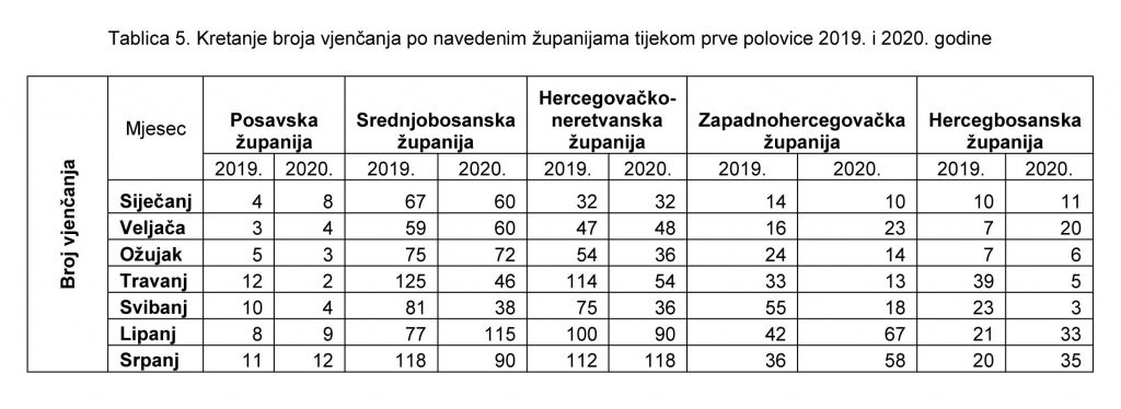 Prilikom istraživanja broja brakova treba uzeti u obzir da se broj brakova tijekom korizme drastično smanjuje po županijama s pretežno hrvatskim stanovništvom, pa i pored te činjenice broj brakova se ove godine u njenoj prvoj polovici godine drastično smanjio. Po županijama situacija je sljedeća: Posavska županija bilježi pad od 20%, Srednjobosanska također bilježi pad od 20%, Hercegovačko-neretvanska pad od 22%, Zapadno-hercegovačka županija bilježi najmanji pad, a on iznosi 7%, što se odrazilo na broj rođenja. Hercegbosanska županija bilježi pad broja brakova za 11% što se razlikuje u odnosu na smanjeni broj rođenja od 22% pa se vjerojatno radi o strahu od rađanja u nesigurnim uvjetima potpomognutim istovremeno pandemijom i gubitkom radnih mjesta. Ipak u blagoj fazi popuštanja pandemijskih mjera koja se vide kroz mjesec lipanj i srpanj, većina županija kao da je htjela nadomjestiti broj propuštenih vjenčanja iz ova prethodna tri mjeseca pa se broj svadbi povećao tijekom lipnja i srpnja (tablica 5).