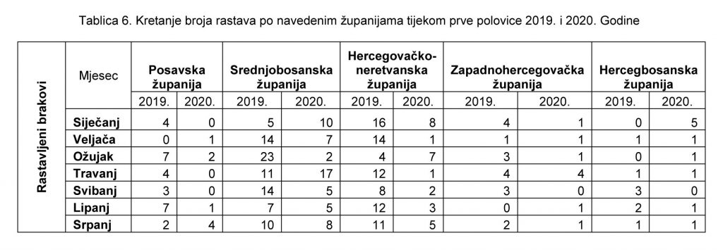 Gotovo u svim županijama došlo je do smanjenja broja rastava (tablica 6) u prvoj polovici 2020. godine u odnosu na isto razdoblje iz 2019., a u nekim i drastičnom smanjenju, tako je u Posavskoj županiji zabilježeno smanjenje od 70%, Srednjobosanskoj za 36%, Hercegovačko-neretvanskoj za 65%, Zapadno-hercegovačkoj za 47%, jedino do povećanja razvoda došlo je u Hercegbosanskoj županiji za 20%, a to je zbog nešto većeg broja rastava u siječnju, prije pandemije, a što je opet u skladu s našom teorijom o povećanom broju rastava na ovim prostorima nakon godišnjih odmora i novogodišnjih blagdana.