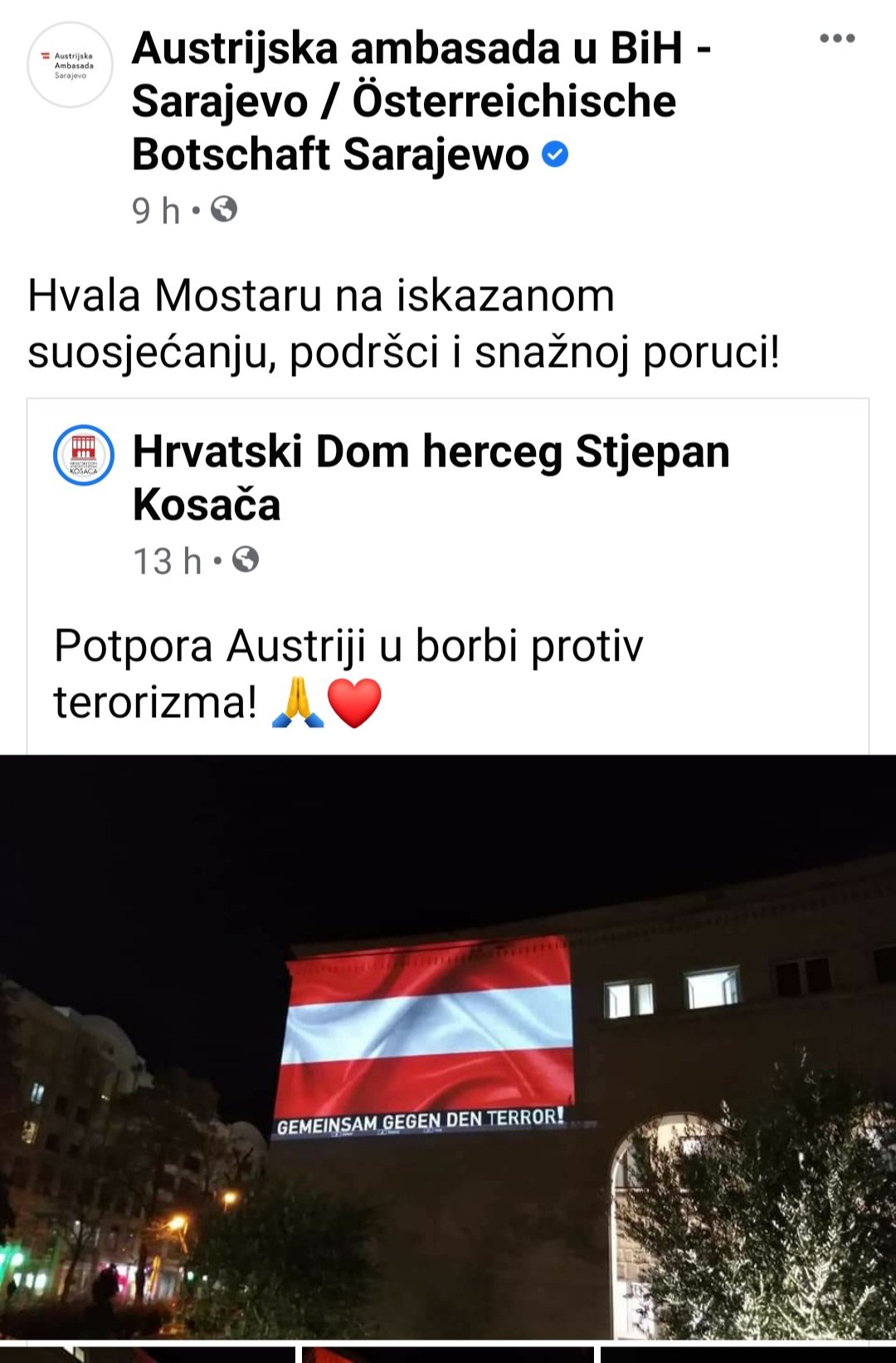 Ova poruka austrijskog veleposlanstva u BiH reakcija je na sinoćnje osvjetljavanje Hrvatskog doma hercega Stjepana Kosače u Mostaru bojama austrijske zastava u znak podrške Austriji u borbi protiv islamskog terorizma.