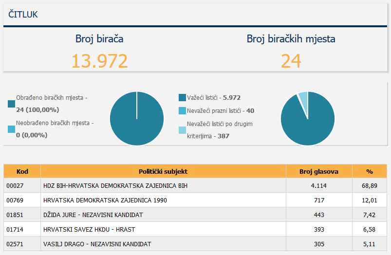 Prema tim podacima nakon obrade podataka na 24 biračka mjesta na području općine Čitluk od važećih 6.134 glasova za načelnika općine Čitluk, Marin Radišić osvojio je 4.351 ili 70,93% (152 glasa više nego 2016. godine).