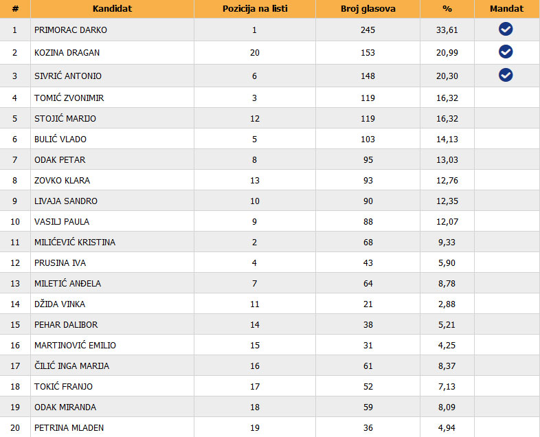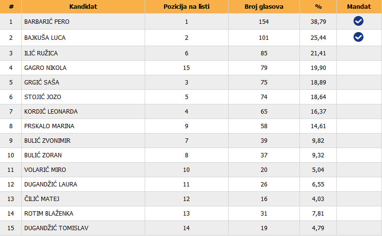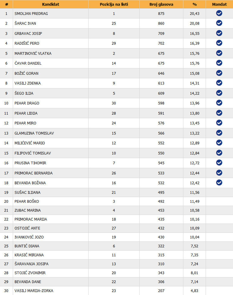 U nastavku možete vidjeti rezultate s brojem glasova za stranke i preferencije: