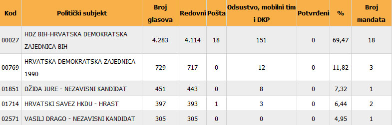 U Općinsko viječe Čitluk ulazi i neovisni kandidat Drago Vasilj s osvojenih 305 ili 4,95% glasova.