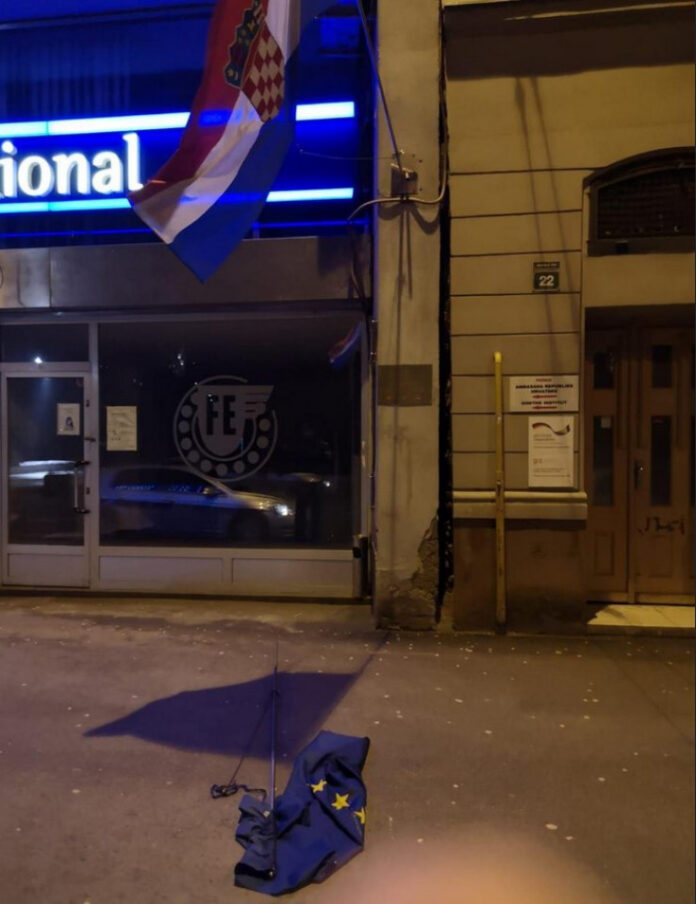 Zastava Europske unije postavljena na pročelju zgrade hrvatskog veleposlanstva u Sarajevu skinuta je i odbačena na ulicu u noći na nedjelju, njezin držač oštećen je i djelomično istrgnut, a policija traga za vandalima koji su to počinili, potvrdio je Hini hrvatski veleposlanik u BiH Ivan Sabolić.