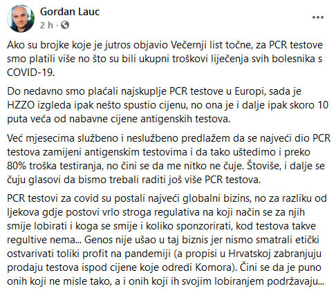 Ako su brojke koje je jutros objavio Večernji list točne, za PCR testove smo platili više no što su bili ukupni troškovi liječenja svih bolesnika s COVID-19 – napisao je u objavi na svome facebook profilu znanstvenik dr. Gordan Lazc